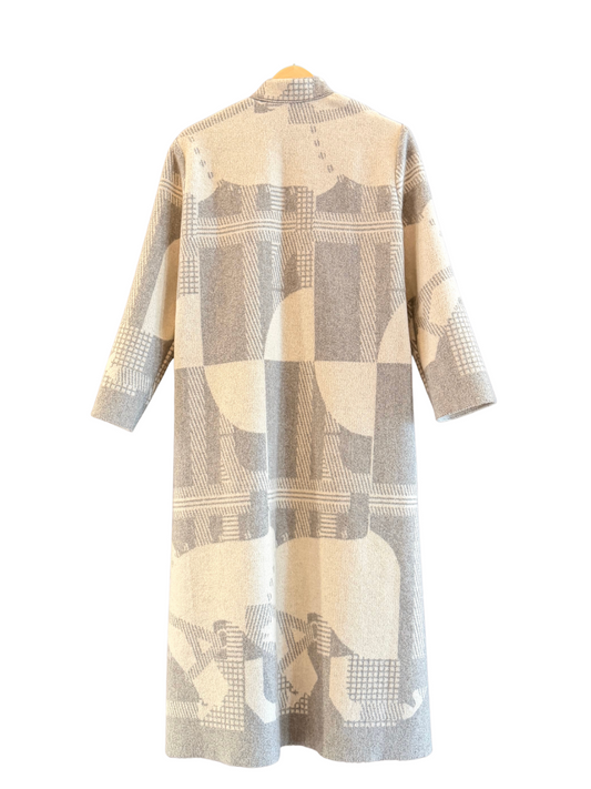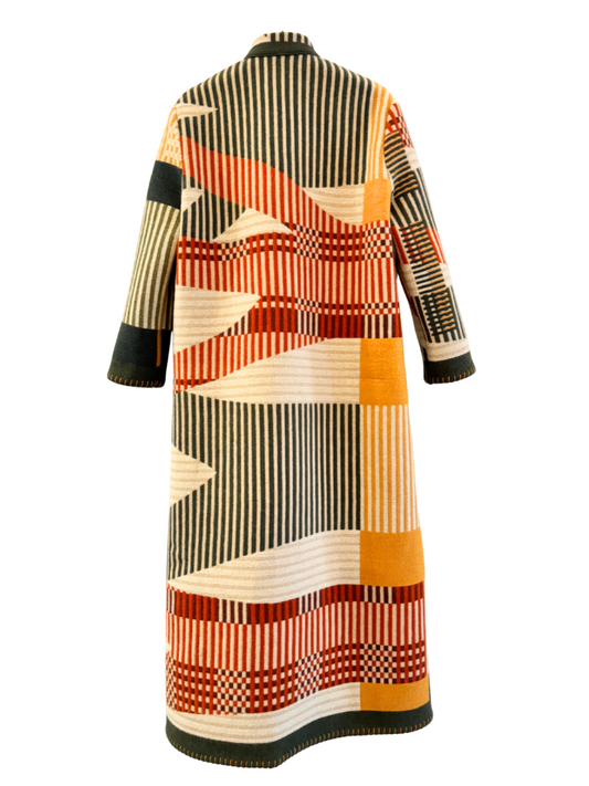 Bold warmth with a story to tell. Each coat is handmade from up-cycled designer blankets, handpicked for their eye-catching textures and rich color play. Designed and sewn by Michel and Lily, these one-of-a-kind pieces turn comfort into couture—merging sustainability with standout style.