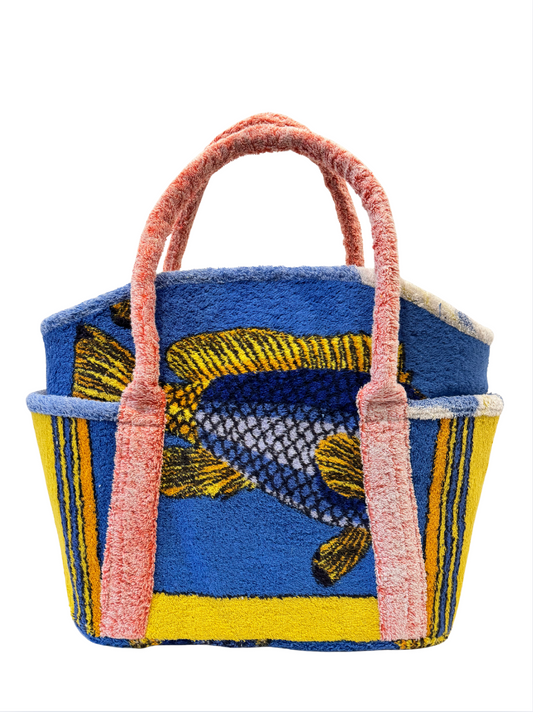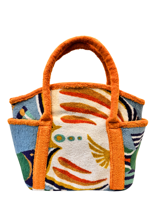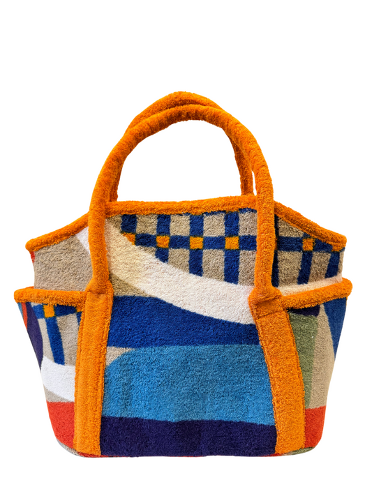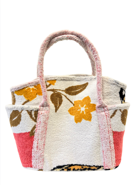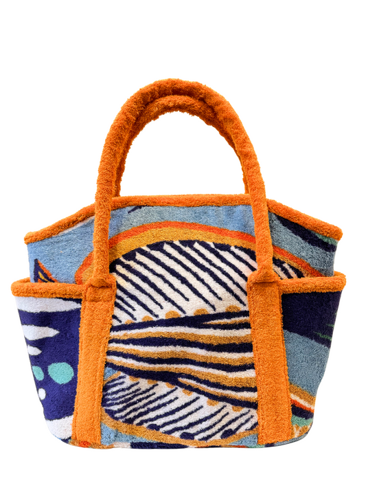 Statement meets sustainability. Each tote is crafted from up-cycled designer terry towels—curated for their vibrant patterns, plush texture, and poolside energy. These one-of-a-kind carry-alls transform sun-drenched nostalgia into everyday style with attitude.