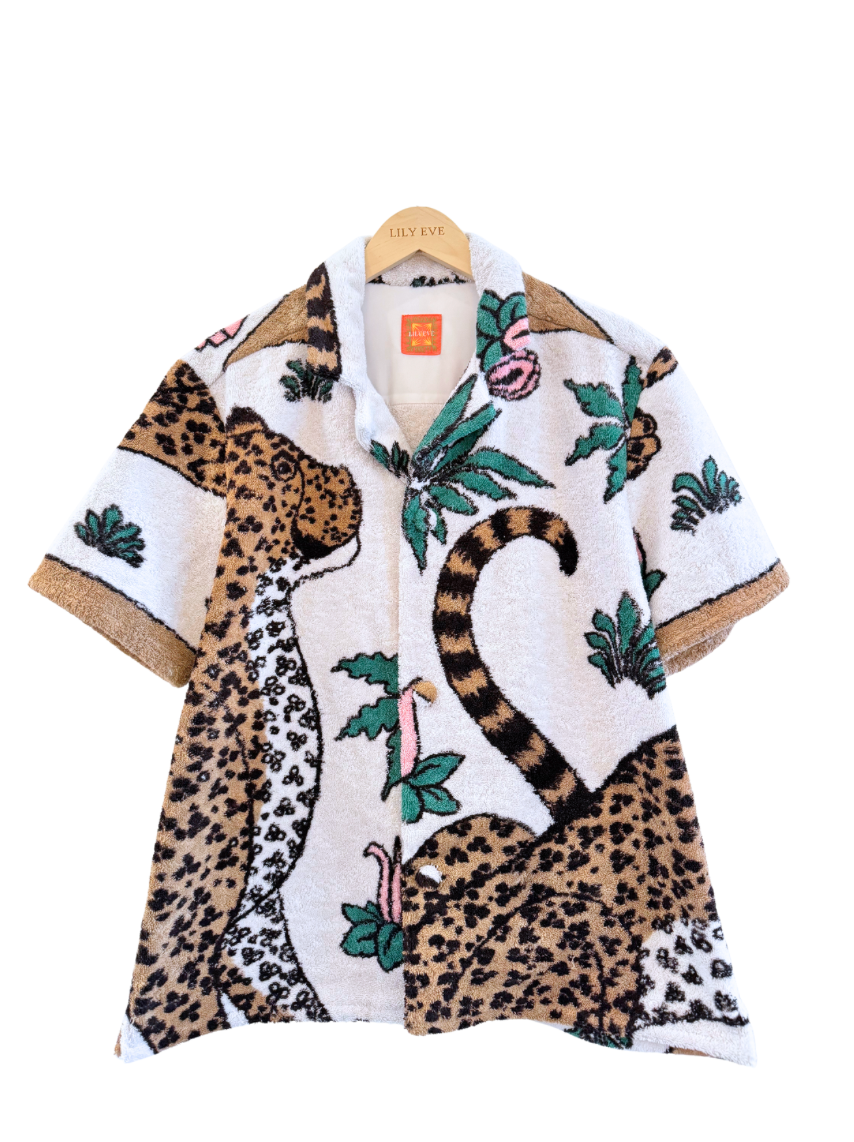 The Pink Leopard Shirt by LilyEve is sustainably crafted from an authentic Hermes towel, transforming terry towel into a one-of-a-kind piece. The underneath of the collar and inside shoulder panel are lined in silk, and the buttons are wrapped in toweling. Proud partners, Michel & Lily use elements of curation and couture to provide unique pieces that stand the test of time.