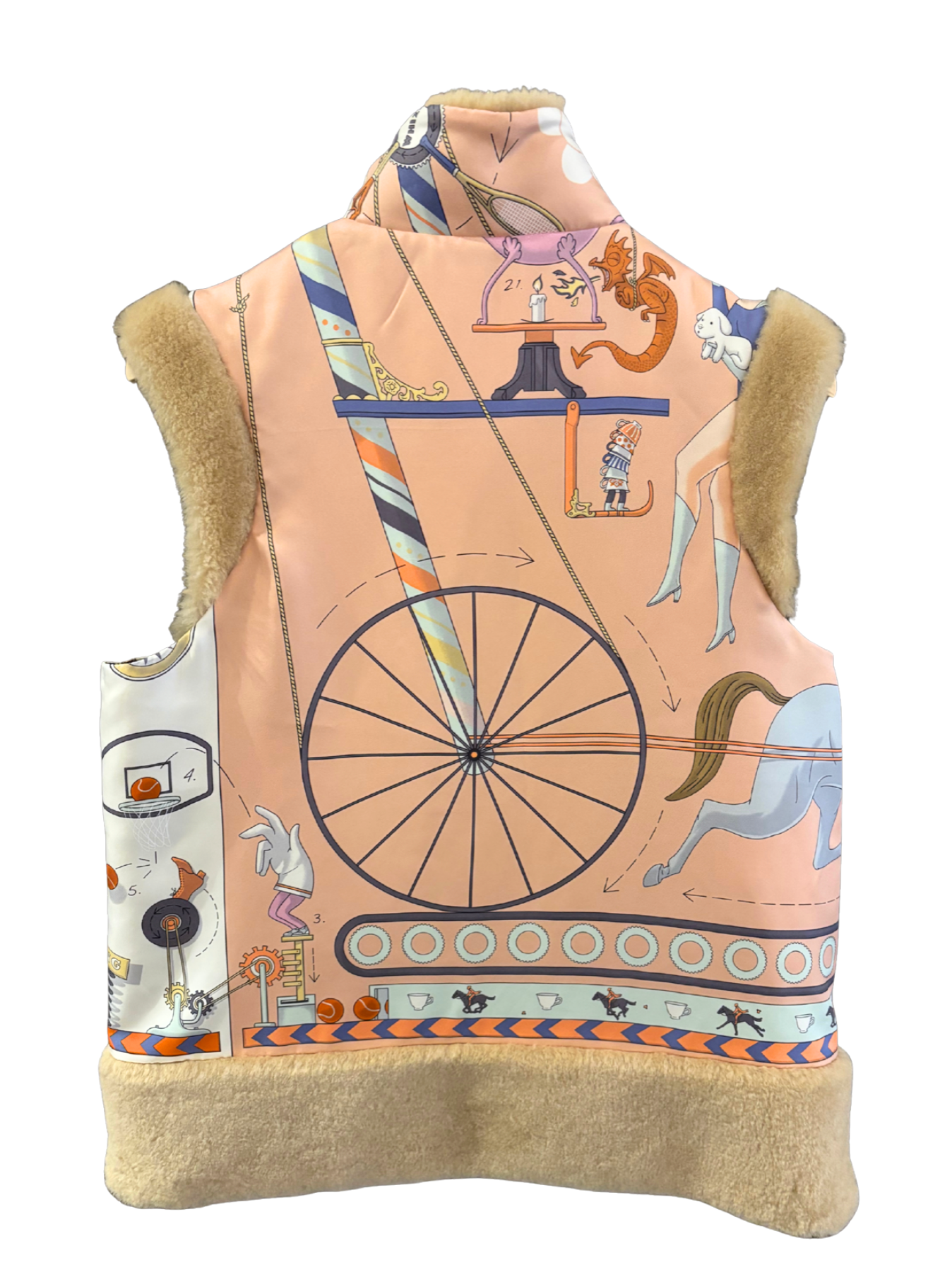 The Shearling Vest Series by LilyEve is sustainably crafted from an authentic Hermes silk scarf & repurposed shearling off-cuts. This process not only reduces waste but also supports sustainability by utilizing natural materials that have a lower environmental impact than synthetic alternatives. Due to the nature of shearling, variations in texture, tone, and pattern are expected, adding to the distinct character of each piece.